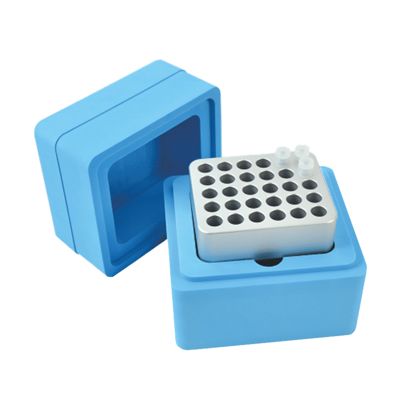 The FreezeBox cooling and preservation devices protect biological samples in low temperatures during bench-top use. To quickly cool samples, the FreezeBox™ has an ice core made from aluminum alloys and a metal alloy tube module with high thermal conductivity. These components ensure that all samples maintain a uniform temperature, guaranteeing consistent research results downstream. The FreezeBox™ comes standard with the Ice Core CL (for temperature range of 0.5℃~4℃) and a tube module for 30 2.00ml cryotubes. Different tube modules and ice cores (to achieve lower temperatures) are available upon request.