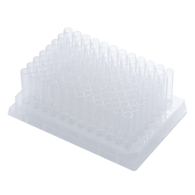 The plate is fully made from polypropylene (PP), lightweight, chemically resistant, and widely used in life sciences. It has room for a total of 96 inserts, which can be purchased prefilled & fixed, tubes in bulk or the plates without the tubes. The plates with prefilled glass tubes have the tubes fixed to the itself. All the plates are supplied with a clear, protective lid, so the glass tubes won’t fall out during transport or storage.