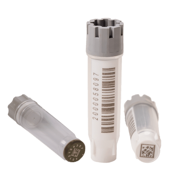 2. 2D codes, such as Data Matrix codes, are typically laser-etched on the bottom of sample tubes for permanent, high-density identification